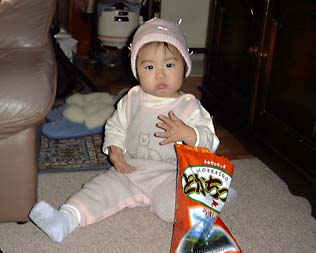 帰りの飛行機は日南子が眠りそうな時間帯の便を予約し、さらに1000円増でレインボーシート(日本エアシステムである)にしたので席が広々としていたのでよかった。予想どおり日南子はぐーぐーだったし、スチュワーデスさんから.おさるのもんきちの可愛いラムネ菓子を貰った。帰りはとてもスムーズだった(しかし、日南子が足で林檎ジュースのカップを蹴飛ばしてしまい、カーペットを汚すというアクシデントが発生。あわててスチュワーデス・コールしてふいてもらいました。すみません)。