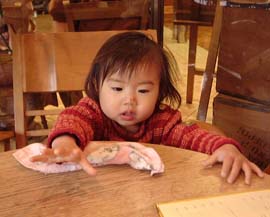 ここのところ、日南子は真基さんと大体同時(8時)に起床する。起きてすぐ居間に連れていき、NHKの「いないいないばぁ」「プチプチアニメ」「おかあさんといっしょ」を見せると寝起きが悪くてもすぐ大喜び。その後9時に朝食を食べる。