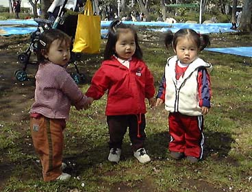 食べ終わった後、ルカちゃんとしおりちゃんがなぜかぼーっと手をつないでいて、とても可愛かったので、無理矢理そこに日南子を参加させてみる。すると3人の1歳児が並んで手をつないでいるという、貴重なショットがとれた。ママ3人で激写しまくりでした。ははは。
