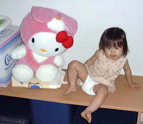 この頃日南子は8時に起きて「いないいないばぁ」「おかあさんといっしょ」を見ながら朝食を食べる。その後日南子はまたベッドに戻ってごろごろ食休み。その間ママは10時過ぎまで掃除や洗濯をする。10時半から12時半ごろまで公園で遊んで、その後スーパーに買い物に行って、帰宅。ちょっとおやつを食べて、1時すぎから3時すぎまで昼ね(大体私も一緒に一休みする)。昼寝のあと、3時ごろに昼食を食べて、夕方は再放送の「いないいないばぁ」を見て、日南子がテレビを見ている間にママは夕食の支度。だいたい1時間くらいで支度が終わるが、そのころ日南子も退屈してまとわりついてくるので、気分転換に家の前の廊下でちょっと遊ぶ。最近は日が長いからありがたい。たまに商店街まで散歩にいったりもする。そうこうするうちに夜になる。夕食は7時前後。食べ終わってすぐに日南子うとうとしだすので、即お風呂に入れる。お風呂では最近シャンプーがこわいらしく、頭を流すためにあおむけにすると狂ったように暴れるのがやっかい。油断するとおなかをぼんぼん蹴ってくる。頭から床に落ちそうになるし危ない。顔を洗うのも同様。とにかく顔がちょっとでも濡れるのがいやなようだ。でも日南子は汗っかきだし、洗わないわけにはいかないので強行突破で片付ける。結構疲れる。風呂からあげるとすっかりごきげんになる。肌着を着せてお茶を飲ませる。大体風呂が8時くらい。で、最近は9時か10時になるともう眠ってしまいます。前は2回昼ねしていたのでどうしても夜12時ごろまで起きていたけど、この頃は早寝早起きです。いいことだ。