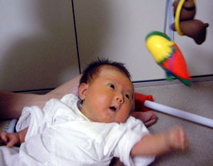午後、日南子の授乳を終え昼寝させてちょっと近くのスーパーに買い物にいく。ほんの15分程度だったので大丈夫だと思っていたが、帰ってみると大泣きしていた。多分、留守中に電話が鳴り響いてびっくりして目を覚し、泣いてしまったのだろうと思う。出かける前は本当によく熟睡していたのだ。目を見ると涙のあとがあり、あまりのかわいそうさに罪悪感。これからはなるべく一緒に連れていくようにしよう。(それとある程度食料を買いだめしておいたほうがいいようだ。)