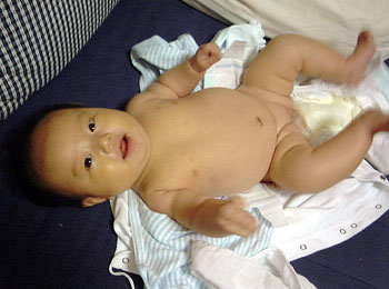 夜に真基さんの同僚の女の子(新谷さん)が日南子を見にきた。可愛い、可愛いと盛んに言ってはくれたものの、やはり男の子っぽいですんえ、と言われてしまいました。(お父さんに似てるからしょうがないねえ。)