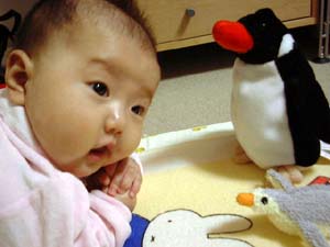 問題のツベルクリン反応の注射で、日南子は異様な雰囲気を察したのか笑みが顔から消える。腕をまくられて押さえ付けられた瞬間にぎゃー。お医者さんは、「打つ前から泣いてるよ」と苦笑。でも日南子の細い腕に針がささるのを見ると私も思わず身をすくめてしまった。かわいそう、、、。でも必要なことだからしょうがない。泣きわめく日南子をなだめて(ショックが強かったようで、しゃっくりまで起こしてしまった。)バスにのっておうちに帰った。その夜、お風呂で針の跡を見る。特別はれてもなく、ぽつっと赤く穴が。明後日にはまた行ってBCGだね。