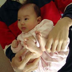 最近、日南子は脚ではずみをつけてよく横向きになるようになった。あと両手両足を変なふうに動かして妙なダンス(?)をする。とにかく動きがだんだん激しくなってきた。声もでかい。嬉しそうにうぎぎぎぎと変な奇声を発する。キャハっと甲高い笑い声も出すようになった。あと、物を自分の意志で掴もうとしはじめている。よく私のスカートとかをひっぱる。おもちゃを手でつついて落としたりする。少しずつ高度な動きをするようになってきている。