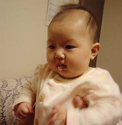 しかし、笑ってる日南子の顔を見ると疲れもふっとぶ。目が合うと、にこーっと笑ってくれるのだ。(ただし機嫌のいい時のみ。)日南子は鏡が大好きで、鏡の前で抱っこしてやると、鏡ごしに私にむかってにかーっと満面笑みになる。その後、なぜか恥ずかしそうに顔をそむける。(前はごんっと私の胸に顔をぶつけてきたが。)おかしいので日に2、3度はやらせてみる。こういう、笑顔とかの特典があるから育児もなんとかやっていけるんだろうなあ。
