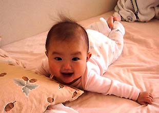 今朝は起きた直後にうつぶせになって少し遊んでた。体調がよくなったのかもしれない。その際に、ほんの少しではあるが、ずって移動していた。ホフク前進である。近くにあった起き上がりこぼしをさわりたかったようである。これってハイハイの前段階なんだよね。早く自分で行きたい所に行ければいいねえ(しかしそうなったら目が離せないか)。