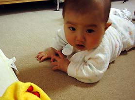 はいはいの練習は、うつぶせにして目の前におもちゃを置きとりにこさせるというもの。目の前に大好きなミッフィーちゃんのタオルを置いてやる。すぐさま目の色を変える日南子。取ろうとするが届かない。で、ちらっと私を上目遣いに見る。暗黙に、「あれ?とってくれないの?」と訴えている。「自分で取りにおいでー」と言って、何も手出しをしないで見守る。日南子は仏頂面で、唸り始めた。 全く動こうと努力しない。そのうち、タオルより手近にあったマットのタグで遊び始めた。どう考えてもタオルのほうが日南子にとって魅力的なものなのだが、取れないと分かって代替品で満足している。むっとしてわざと目の前でタオルをちらつかせる。するとやはりタオルのほうが好きらしく、釘付けになる。しかし、やはり取って渡してくれない私に怒りの叫び声をあげ始めた。うるさいので、折れて渡してやる。全くーこのワガママ娘め。しかし、もうタオルなどどうでもいいらしく、泣き始めた。やれやれ。