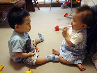 うちによその赤ちゃんが遊びに来たのは日和ちゃん以来。カー君は間取りが同じだけど家具とか違うなあという感じできょろきょろしていた。台所が好きなようで、何度も私の手をひっぱって台所にいく。保存壜の空きビンが気になるようで、何度も触る。日南子はあいかわらずカー君にぺたぺた触って、カー君の服につかまって立とうとする。立っているカー君の後ろにまわっておしりを触ったりする。おいおい、日南子、エッチだなあ。