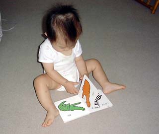 ここ2、3日、日南子は絵本に興味をしめしだした。今まではどちらかというとなめたり噛ったりするほうに夢中だった。友人のえっちゃんから貰った赤ちゃん絵本の動物を、ページをめくってながめている。やっと絵本に目覚めたか、と思い、いとこのリサから貰ったとびだす絵本を見せたところ、とびだし部分の熊さんをちぎってしまった。やれやれ。修理しなければ。